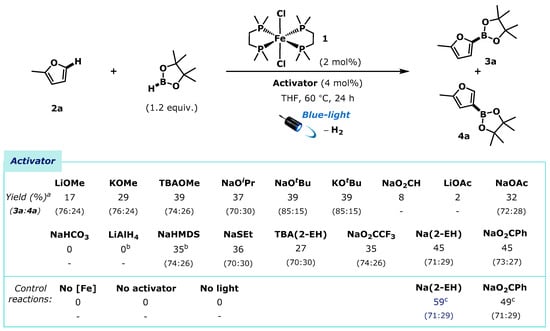 Activator screening for the borylation of 2-methyl furan by dmpe2FeCl2 1. a Yields determined by 1H-NMR spectroscopy of the crude reaction mixtures using 1,3,5-trimethoxybenzene as an internal standard. Product ratios were determined by 1H-NMR spectroscopy of the crude reaction mixtures. b Reaction time = 15 h. c Reaction time = 48 h. 2-EH = 2-ethylhexanoate. TBA = tetra-n-butylammonium.