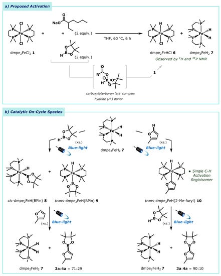 As the dihydride complex dmpe2FeH2 7 was readily formed using our in situ hydride transfer method, and was observable by 1H and 31P-NMR spectroscopy, we next investigated the fundamental steps of this borylation reaction with the aim of identifying key reaction intermediates. Reaction of the in situ generated dmpe2FeH2 7 with excess HBpin under blue light irradiation led to the formation of both cis-dmpe2FeH(Bpin) 8 and trans-dmpe2FeH(Bpin) 9 boryl iron complexes, as observed by 1H, 11B, and 31P NMR spectroscopy (see Supplementary Materials, S17-19). These complexes were previously reported by Darcel and co-workers, where they were formed from the reaction of the related dialkyl complex, dmpe2FeMe2, with HBpin [37]. Addition of 2-methylfuran 2a to the mixture of cis-dmpe2FeH(Bpin) 8 and trans-dmpe2FeH(Bpin) 9 under blue light irradiation gave the formation of the regioisomeric furyl boronic esters 3a and 4a (3a:4a = 71:29), notably in a different ratio to that observed during catalysis (vide supra, 3a:4a = 81:19).