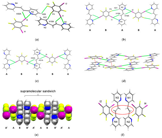 Perspectives of 2(1,3-di-I-tFb)·2(2,2′-bpe): (a) asymmetric unit (olefin disorder omitted for clarity); (b) 1D chain based on N1/N2 illustrating ABAB repeat unit; (c) 1D chain based on N3/N4 illustrating ABAB repeat unit; (d) offset, face-to-face π-stacks (highlighted in red) between chains; (e) face-to-face π-stacked sandwiches (space-filling) illustrating ABB’A’ repeat unit; and (f) π-stacked sandwiches highlighting criss-crossed C=C bonds (olefin disorder omitted for clarity).
