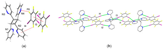 Perspectives of 2(1,3-di-I-tFb)·(2,2′-tpcb): (a) asymmetric unit highlighting π···π and π···F forces (cyclobutane disorder omitted for clarity) and (b) 1D chains (H atoms omitted for clarity).