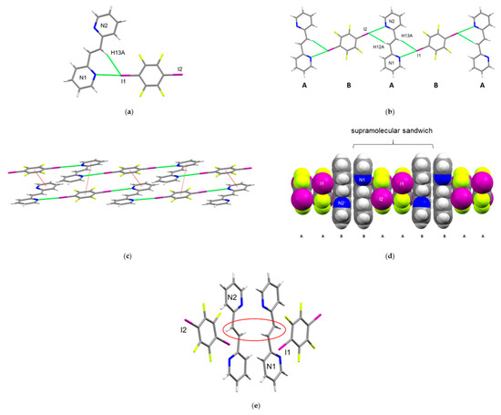The components of 2(1,3-di-I-tFb)·2(2,2′-bpe) crystallized in the orthorhombic, noncentrosymmetric space group Pna21 (Table 1). The asymmetric unit consists of two molecules of 1,3-di-I-tFb and two molecules of 2,2′-bpe that assemble by a combination of N···I X-bonds (d(I1···N1) = 2.96(2) Å; d(I2···N2) = 3.00(1) Å; d(I3···N3) = 2.99(1) Å; d(I4···N4) = 3.04(1) Å) (Table 2), as well as edge-to-edge C-H···I and C-H···F contacts (Figure 1a, Table 3). The pyridyl rings of one molecule of 2,2′-bpe (N1/N2) lie perfectly coplanar (twist angle = 0.00°), whereas the pyridyl rings of the other (N3/N4) deviate from coplanarity (twist angle ~ 5.35°). Both molecules of 2,2′-bpe adopt an anti-conformation (Figure 1a). The C=C bonds of each molecule of 2,2′-bpe lie disordered over two sites (occupancies: 72/28 [N1/N2]; 72/28 [N3/N4]). The major fraction (72%) of nearest-neighbor C=C bonds lie criss-crossed [13].