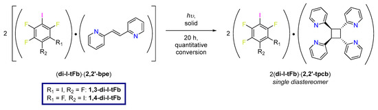 UV-irradiation of 2(1,3-di-I-tFb)·2(2,2′-bpe) and (1,4-di-I-tFb)·(2,2′-bpe) to form 2,2′-tpcb.