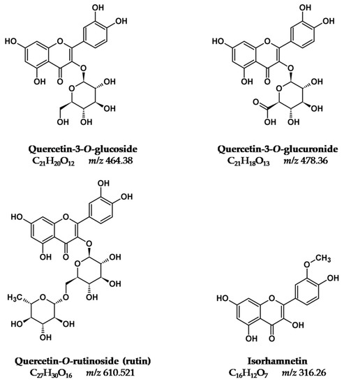 Quercetin (C15H10O7), luteolin (C15H10O6), kaempferol (C15H10O6), isorhamnetin (C16H12O7), apigenin (C15H10O5), ellagic acid (C14H6O8), luteolin-7-O-glucoside (C21H20O11), Luteolin-3′,7-di-O-glucoside (C27H30O16), kaempferol-3-O-glucoside (C21H20O11), quercetin-3-O-glucoside (C21H19O12), quercetin-3-O-glucuronide (C21H18O13), and rutin (C27H30O16) analytical standards were purchased from Extrasynthese.