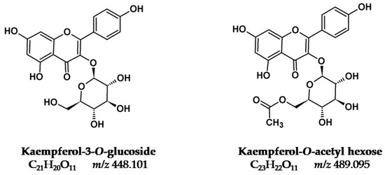 Morus alba: The UV-VIS spectra obtained at 350 nm for plant and dyed wool extracts indicated that the main yellow compounds had a flavonol structure (Table S1-C). Based on the HRMS/MS spectra, the more intense signals at 18.63 (6.08) and 19.03 (6.41) min were identified as rutin and quercetin-3-O-glucoside, respectively, in accordance with previous results [21,22]. Minor peaks eluting at 19.77 (6.66), 19.87 (7.03), and 20.33 (7.43) min were assigned to O-glycoside derivatives of kaempferol. Although the more abundant yellow components were 3-O-glucoside flavonols, signals related to their aglycones were not found in the dyed wool extracts.