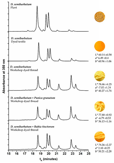Samples were extracted and the solutions analyzed by HPLC-DAD-LRMS and HPLC-DAD (Figure 4). The colors of the threads were measured in the CIELAB color system (Figure 4). It was interesting to observe that in the workshop samples, the parent aglycones were present in very relevant amounts, reinforcing the trend already described in the extracts of our wool references. This means that, possibly, wool threads were dyed with higher temperatures and/or over longer periods then our reference samples. By HPLC-DAD-LRMS, it was possible to detect the presence of alizarin in the samples dyed with both D. semibarbatum and R. tinctorum, but in much lower amounts when compared with samples from 17th c. Persian carpets [24]. In these historical samples, alizarin was detected only in orange colors, where it may have applied in higher amounts than in the workshop samples. In the extracts of D. semibarbatum + P. granatum, it was possible to detect the presence of ellagic acid, but not of the punicalagin isomers. It is worth noting that when comparing the chromatographic profiles for D. semibarbatum + R. tinctorum and D. semibarbatum + P. granatum, the latter presented higher amounts of the parent aglycones (closer to the profile of samples dyed only with D. semibarbatum). As a general trend, all the extracts obtained from the workshop presented significantly higher concentrations of the parent aglycones when compared with our dyed wool extracts. On the other hand, our dyed samples, in terms of aglycone concentration, compared well with extracts obtained from 17th c. Persian carpets [25].