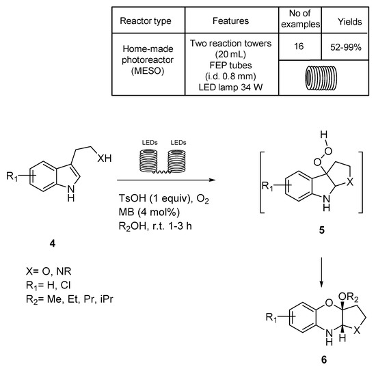 Optimization of the reaction in flow has been performed using a home-made capillary continuous-flow photoreactor already used in another work from the same authors [22]. It was assembled by connecting in series two reactors towers made of quartz glass tubes (i.d. 75 mm) with a fluorinated ethylene propylene FEP tube coiled inside and irradiated by an LEDs corn light bulb (34 W). The indole derivative 4 in the presence of catalytic methylene blue (MB), O2, and alcohol first yielded the peroxide intermediate 5, which after a rearrangement, gave the desired tricyclic-1,4-benzoxazine 6 at room temperature. The best acid to be employed resulted in being TsOH; while the reaction didn’t work in the absence of O2, yields were lower when CH3CN was used as the solvent instead of alcohol. The scope of reaction was tested by synthesizing a library of 16 products using methanol, ethanol, propanol, and isopropanol as alcohol. All the products have been obtained in 1–3 h, whilst the batch procedure required 24 h. The gram-scale reaction was also performed to prove the scalability of the new synthetic protocol.