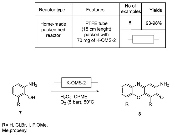The flow procedure herein discussed is a further improvement of the batch synthesis proposed by the same authors [25]. The catalyst of choice was the K+ form of octahedrall molecular sieves (K-OMS-2) first synthesized by Suib [26]. The structure possesses octahedral manganese oxides ions connected via edges and vertices with an average oxidation state of 3.8. The large surface area (up to 250 m3/g), robustness, and easy of synthesis make this catalyst an optimal candidate for oxidation processes. Careful optimization has been performed in order to choose the right combination of oxidant (O2/H2O2), amount of catalyst, and residence time. As a solvent, cyclopentylmethyl ether (CPME) was selected for its low toxicity profile and low tendency to form peroxides. In this tailor-made system, the catalyst was safely packed in a polytetrafluoroethylene PTFE tube (15 cm length), and only minimal leaching of the manganese catalyst was detected; the molecular oxygen line served as a driving force to move the reaction mixture throughout the reactor. A variety of 2-aminophenoxazin-3-ones 8 has been therefore synthesized with excellent yields (93–98%) and no need for further purification. The sustainability of the process was highlighted by E-factor values calculation and comparison with the batch protocol and other literature processes values. From this green metric, it was possible to evaluate the beneficial effect of the flow methodology that allowed obtaining E-factor values as low as 1.6 in flow, whereas values in the range of 19 were obtained for the corresponding batch procedures; literature procedures showed even higher E-factor values (68–368).