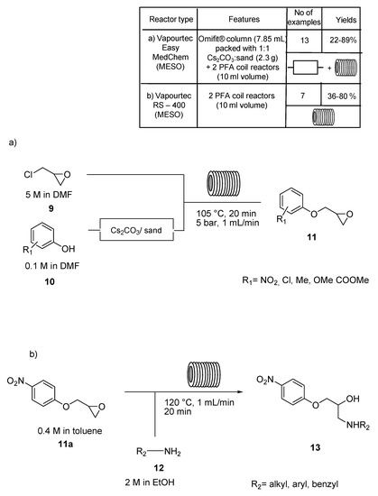 (a) Flow synthesis of epoxy ethers 11 from epichlorohydrin 9. (b) Flow synthesis of β-amino alcohols 13 from amine mediated-epoxide ring-opening process.