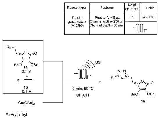 Raić-Malić and co-workers published an interesting study on the flow-synthesis of a new series of molecules containing either the l-ascorbic acid (i.e., Vitamin C) and 1,2,3-triazole moieties [28]. The idea behind the work was to combine the well-known properties of Vitamin C with those of 1,2,3 triazoles and test such new molecules for biological properties. The authors first synthesized the azide derivative of l-ascorbic acid 14 to be employed in a click chemistry reaction with a wide array of alkynes 15 to form the 1,2,3-triazole unit (Scheme 5). Specifically, in a microfluidic system combined with ultrasound (US) irradiation, 1,2,3-triazolyl appended 4,5-unsaturated l-ascorbic acid derivatives 16 were synthesized through a copper-mediated 1,3 dipolar cycloaddition of C–6 azido l-ascorbic acid derivatives 14 and terminal alkynes 15. The same transformation has also been performed in batch condition, but the flow methodology gave superior results either in terms of yields and of reaction times. In fact, for each of the 14 new products 16 the yield in flow resulted to be significantly better than that obtained in batch; furthermore, the optimal reaction time in flow resulted in being in the range of minutes whilst the reaction time in the batch was in the range of hours. Additionally, from the point of view of the safety profile, the flow protocol was again the preferred option; in fact, when extremely reactive azides are handled, it is of great advantage to able to let the reaction run inside proper equipment instead of performing traditional batch procedures [29].