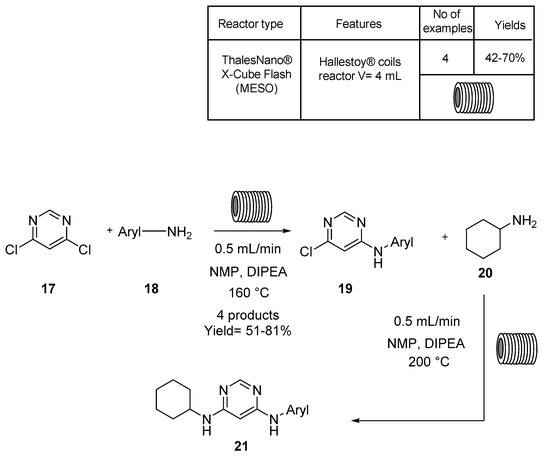 In the first step, nucleophilic substitution of 4,6-dichloropyrimidine 17 with aromatic amines 18, occurred at 160 °C in a ThalesNano X-Cube Flash at 0.5 mL/min in NMP under base catalysis (DIPEA) to yield mono-substituted pyrimidines 19. Such intermediates could be isolated and characterized, but for a more efficient process, they could also be directly mixed with cyclohexylamine 20 to perform the second step in the same reactor at 200 °C at 0.5 mL/min. Screening of the reaction conditions such as the concentration of the reactants and temperature were monitored using UHPLC analysis. In conclusion, a library of 4,6-disubstituted pyridines 21 was successfully synthesized using a flow system that allowed to obtain good yields (51–81% first step and 42–70% second step) with a residence time in the range of minutes.