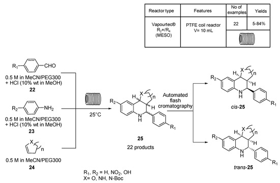 The reaction of choice to build-up the molecular skeleton was the Pavarov cycloaddition in which p-substituted benzaldehydes 22, anilines 23 and five- or six-member dienophiles 24 dissolved in MeCN/PEG300 (95:5 v/v) were combined together in a 10 mL PTFE reactor coil in the presence of HCl as catalyst to yield the desired tricyclic-tetrahydroquinolines 25 (Scheme 7).