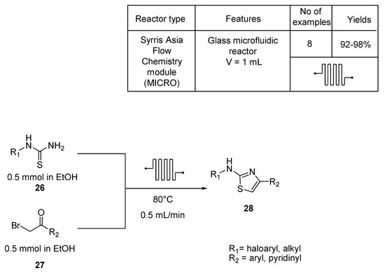 A library of small molecules, namely 1-aminothiazole derivatives, has been synthesized in flow by John and co-workers in the framework of a wider project concerning Alzheimer’s disease (AD) [35]. In particular, the authors aimed to obtain small molecules that mimic the Humanin (HN) peptide interaction with the extracellular domain of the gp130 receptor in agonist fashion and ultimately protect neurons from NMDA-induced neurotoxicity [36]. In order to synthesize 1-aminothiazoles 28 the Hantzsch condensation reaction was chosen, therefore, a set of 1-(4-bromophenyl)thiourea derivatives 26 and 2-bromo-1-phenylethan-1-ones 27 were allowed to react in a microfluidic system at 80 °C without the aid of any catalyst (Scheme 8). It was possible to obtain eight small molecules in very good yields and suitable for gaining SAR insights. In particular, the 1-aminothiazole with R1 = 4-fluoroaryl and R2 = aryl resulted in being the best candidate for neuroprotective activity and, therefore, will be used for in vivo tests.