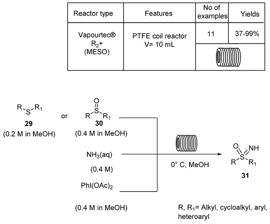 NH-Sulfoximines are an interesting class of compounds that, even though not very commonly found in the literature, are rapidly gaining the attention of the scientific community [37,38]. Such spike in interest is due to their use in the synthesis of sulfurated products, and in the drug discovery field, in fact, some sulfoximines-bearing compounds are promising pharmaceutically active molecules [39,40]. Luisi and co-workers set up a new convenient protocol for the synthesis in flow of sulfoximines starting from sulfides or sulfoxides [41]. The procedure is a modified and improved version of a batch procedure described by the same group [42]. The conversion of sulfides or sulfoxides occurred in the presence of an ammonia source and of phenyliodo diacetate (PhI(OAc)2). Careful evaluation of experimental parameters such as solvent, reactants stoichiometry, and concentrations and source of ammonia was performed in order to set up a flow system able to smoothly afford the desired NH-sulfoximines. All the optimization studies were performed using the commercial apparatus Vapourtec R2 system equipped with a 10 mL PTFE coil. Methanol was chosen as solvent as it proved to be ideal in the batch reaction, an aqueous solution of ammonia (28% w/w, 3 equiv.) was selected as N source. Other reagents proved to be effective but more difficult to handle. The amount of PhI(OAc)2 employed was lowered to 2 equivalents compared to 2.5 equiv. used in the batch procedure. When sulfides were used as starting material, the concentration was set to 0.2 M in order to avoid clogging of the reactor, but when sulfoxides were employed more concentrated solution was needed (0.4 M) for the reaction to occur. In the latter case syringe pumps were employed to feed the reactor. Finally, with the optimized conditions in hand, the authors were able to employ different sulfides 29 and sulfoxides 30 to yield 11 NH-sulfoximines 31 with yields ranging from 37 to 99% (Scheme 9).