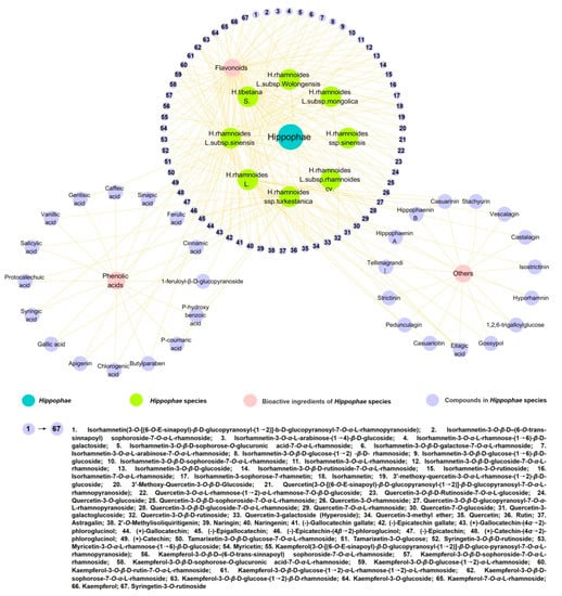 Hippophae is a member of the Elaeagnaceae family, in which 7 species and 11 subspecies have been identified worldwide [4]. Hippophae is widely used in various fields, such as the food, medicine and cosmetic industries. Hippophae rhamnoides L., the representative plant of the genus Hippophae, can be used as a food and medicine [5] (Figure 1). Studies have shown that various nutrients and bioactive components are present in Hippophae. These include minerals, vitamins, polysaccharides, unsaturated fatty acid, terpenoids, polyphenolic compounds, nonsteroidal compounds, flavonoids, organic acids and volatile components, which have antioxidant, anti-inflammatory, anti-radiation and curative effects on burns and ulcers [6,7]. Polyphenols are secondary plant metabolites, arising from phenylalanine or shikimic acid, playing a pivotal role in counteracting various type of stress, other than contributing to the organoleptic properties of plants and plant-derived food [8]. In addition, it is well known that polyphenols exert beneficial effects upon human health, due to their antioxidant, anti-inflammatory, cardioprotective, anticancer and antimicrobial properties [9,10]. The antioxidant activity of sea buckthorn (H. rhamnoides L.) is mainly due to the redox characteristics of polyphenolic compounds, which mainly contain flavonoids, phenolic acids and tannins. In particular, kaempferol, quercetin, isorhamnetin, catechin, procyanidins and gallic acid are commonly present as bioactive compounds [11]. H. rhamnoides L. is a good source of active phenols for human consumption, and it plays an important role in many physiological and metabolic processes. The active compounds and metabolites of Hippophae plants have an antioxidant effect, making them suitable candidates of new functional foods [12]. In addition, Hippophae is rich in unsaturated fatty acids; its unsaturated fatty acid content is higher than its saturated fatty acid content, which usually accounts for approximately 58% to 88.9% of the total fatty acids. The content of the seed of Hippophae is the highest, which leads to the rich biological activity of sea-buckthorn oil. Hippophae plants are also rich in carotenoids, which have anticancer, anti-ulcer and growth-stimulating effects. Therefore, sea buckthorn is a promising plant containing many dietary and medicinal compounds with potential beneficial applications for improving human health [13].