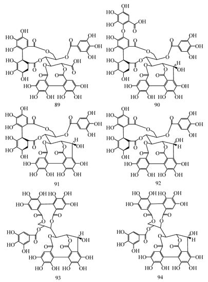 In addition to flavonoids and phenolic acids, Hippophae species contain tannins. Tannins are water-soluble polyphenol compounds found in alkaloids, polysaccharides and proteins with relatively high molecular weight [40]. They can be subdivided into hydrolysable and concentrated tannins. Hydrolyzed tannins include gallic acid esters (gallic acid and ellagic-tannin), and because the molecule has an ester bond and glycosidic bond, it can be hydrolyzed into a small molecule compound and sugar or polyol. Condensed tannins (also known as proanthocyanidins) are polymers of the polyhydroxyflavan-3-alcohol monomer [12]. Their basic structures are formed via the condensation of catechin, (-) epicatechin, and other flavan-3-alcohols or flavan-3,4-glycols at position 4,8- or 4,6 within their carbon–carbon bonds. Tannins isolated from Hippophae species mainly include strictinin, 1,2,6-trigalloylglucose, hyporhamnin, isostrictinin, tellimagrandin I, pedunculagin, hippophaenin A, casuaricitin, casuarinin, stachyurin, Hippophaenin B, castalagin and vescalagin. Gossypol, a phenolic aldehyde, was also found in Hippophae species. The chemical constituents and structures of tannins in Hippophae species are shown in Figure 5 and Figure 6, as well as Table 3 and Table 4.