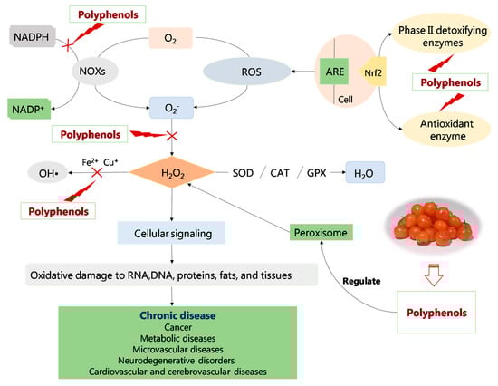 The antioxidant mechanism of polyphenols from Hippophae species. (NADPH: nicotinamide adenine dinucleotide phosphate; NADP+: nicotinamide adenine dinucleotide phosphate; NOXs: NADPH oxidases; SOD: superoxide dismutase; CAT: catalase; GPX: glutathione peroxidase).