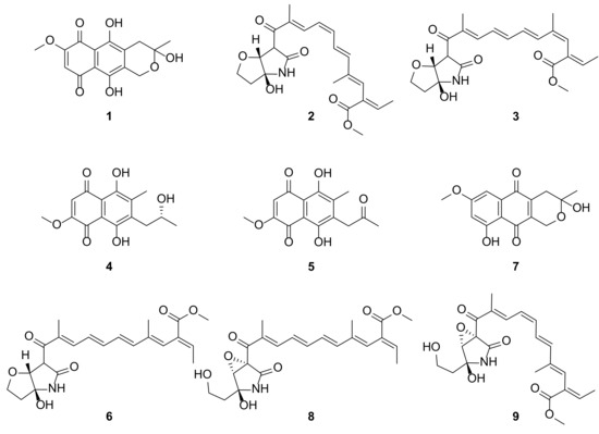 - Kimura, Y.; Shimada, A.; Nakajima, H.; Hamasaki, T. Structures of naphthoquinones produced by the fungus, Fusarium sp., and their biological activity toward pollen germination. Agric. Biol. Chem. 1988, 52, 1253–1259. [Google Scholar] [CrossRef]