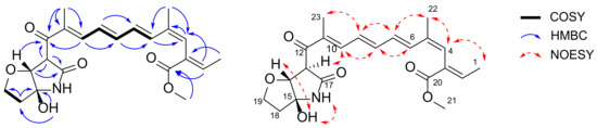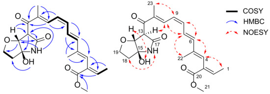 Compound 2 was isolated as a yellow amorphous solid with molecular formula C22H27NO6 as determined by a protonated ion peak at m/z 402.1921 [M + H]+ in high resolution mass spectrum. The spectroscopic data, including 1H- and 13C-NMR spectra, as well as MS and UV spectra of 2 were very similar to those of lucilactaene (6), which contained pentaene and furanopyrrolidone moiety (Figure 1, Table 1). The interpretation of 1D and 2D NMR data of 2 confirmed the presence of pentaene and furanopyrrolidone moieties (Figure 2). However, several 1H-NMR peaks corresponding to the pentaene parts of 2 were observed to be shifted (three upfield shifted olefinic signals: H-8 at δH 6.58 (1H, t, J = 11.4), H-9 at δH 6.40 (1H, t, J = 11.4), and H-10 at δH 7.97 (1H, d, J = 11.4); a downfield shifted olefinic signal: H-7 at δH 6.95 (1H, dd, J = 15.0, 11.4)). In particular, the coupling constant between H-8 and H-9 in 2 was measured as 11.4 Hz, whereas that of 6 was observed as 14.5 Hz. This indicated the 8Z-configuration of 2, and this was further confirmed by a key nuclear Overhauser effect spectroscopy (NOESY) correlation between H-7 and H-10. The NOESY correlations (H-1 and H-4; H-4 and H-6; H-6 and H-8; H-7 and H-22; H-9 and H-23) and relatively large coupling constants between H-6 and H-7 (J = 15.0) in 1H-NMR spectrum suggested E geometry on the conjugated double bonds except for 8Z (Figure 2).