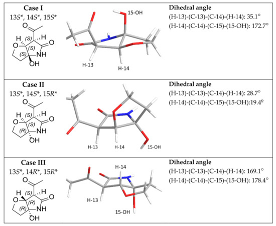 The stereoisomers of furanopyrrolidones were subjected to conformational analysis using Spartan 16 (Wavefunction, Irvine, CA, USA) and Merck Molecular Force Field (MMFF). Each conformers of four stereoisomer having low energy with less than 10% of Boltzmann distribution were further analyzed for energy minimization by Gaussian 16 (Gaussian Inc., Wallingford, CT, USA) with B3LYP function and 6-31+G (d, p) basis set in chloroform. The 3D structure of lowest energy conformers of four stereoisomers were chosen for calculation of dihedral angles between H-14 and 15-OH.
