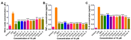 Compounds 1, 4, 5, and 6 were previously reported to be cell cycle inhibitors or cytotoxins against cancer cells. Therefore, the cell viability of the isolated compounds were first tested on the macrophage (RAW264.7) and none of the isolates show cytotoxicity at concentrations ranging between 0.7 to 50 μM (Supplementary Materials, Figure S36). Thus, the biological activity of isolated compounds and dexamethasone (DEX; control drug) was evaluated at the concentration of 10 μM. Inflammatory disease is activated by relative oxidative stress and pro-inflammatory cytokines interlukin-6 (IL-6) and tumor associated factor-α (TNF-α). Therefore, the anti-inflammatory activity of isolated compounds via production of NO (nitric oxide), TNF-α, and IL-6 in LPS-induced macrophage cells was evaluated (Figure 5). Lipopolysaccharides (LPS) notably increased NO production in macrophage cells. However, treatment of DEX or isolated 1–9 inhibited NO production. Similarly, the expression of pro-inflammatory cytokines such as TNF-α and IL-6 was suppressed after treatment of DEX or 1–9 on LPS-induced macrophage cells (Figure 5).
