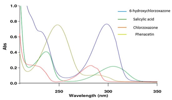 | Isocratic elution mode (60% H2O + 25% Acetonitrile + 15% Methanol) T = 25 °C | Salicylic acid (100 µM) | 3.425 | 153201.667 ± 0.1842 | Better resolution obtained between four components. (Difference between Phenacetin and chlorzoxazone peaks = 3.0544 min) |
