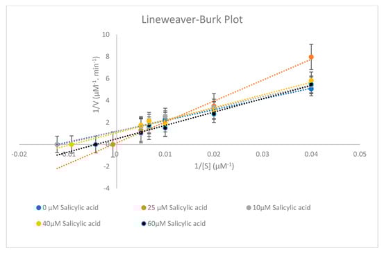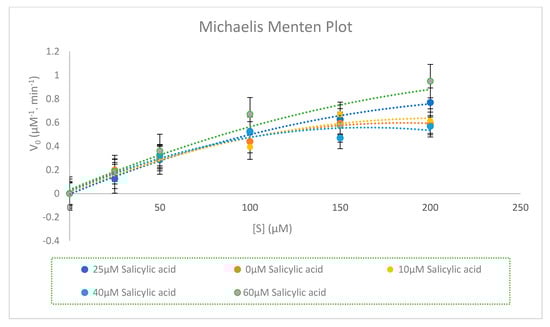 | Parameters of Enzyme Metabolism | 0 µM Salicylic Acid | 10 µM Salicylic Acid | 25 µM Salicylic Acid | 40 µM Salicylic Acid | 60 µM Salicylic Acid |