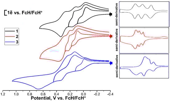In this respect, cyclic voltammetry (CV) is a very useful technique to evaluate the multi-step multi-electron transfer processes of molecules with multiple redox-active sites. Moreover, the CV measurements of multi-ferrocene derivatives provide important information on the degree of electronic communication between the ferrocene and ferrocenium cation.