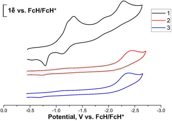 Cyclic voltammograms for reduction of 1–3. Conditions: 0.5 mM solutions of 1–3 in CH3CN, 0.1 M [NBu4][BF4]; working electrode: glassy carbon, 10 mVs−1, peak potential in V ref. Ag/AgCl recalculated to FcH/FcH+.