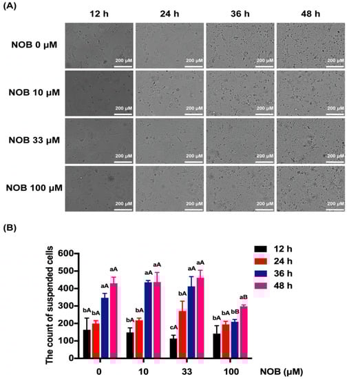 With the extension of culture time (24, 26, 48 h), the cell proliferation was obvious, and the dead cells, cell debris, and metabolites suspended in the culture medium increased significantly (Figure 2A). The cells that floated in the culture medium were counted by a Cytation™ 5 Cell Imaging Multi-Mode Reader (Figure 2B). The number of suspended cells increased significantly after 48 h of incubation in non-NOB-treated cells. Cells treated with 100 μM of NOB significantly reduced the number of suspended cells compared with non-NOB-treated cells after 36 and 48 h culturing.