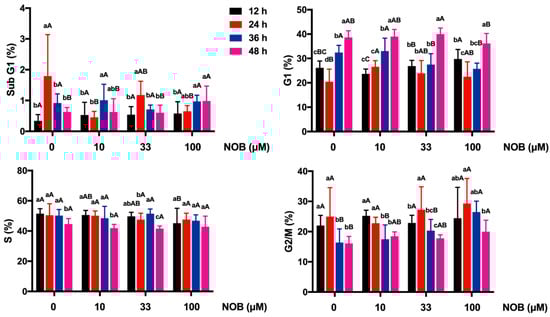 The effect of NOB on cell cycle distribution of BeWo cells. Cell cycle distribution of BeWo cells in subG1, G1, S, and G2/M phases were detected by flow cytometry. Data were summarized as mean ± SD, n = three independent experiments. At the same NOB treatment dose, different lowercase letters represent significant differences at different treatment times, p < 0.05. At the same treatment time, different capital letters represent significant differences at different NOB doses, p < 0.05, one-way ANOVA, with Duncan’s multiple range test.