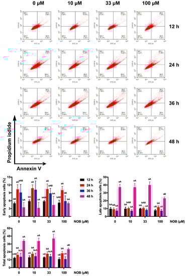 Annexin V and PI stainings were used to conduct flow cytometric analysis of apoptotic status (Figure 5). Early apoptosis of non-NOB-treated cells increased after 24 and 36 h of culturing, and then decreased after 48 h of culturing. No significant difference in late apoptosis of non-NOB-treated cells manifested when measured after 12, 24, and 36 h of culturing, while a remarkable increase of late apoptosis after 48 h of culturing was observed. Compared with non-NOB-treated cells, no significant difference in the proportion of apoptotic cells (early, late, total) was revealed following low-dose NOB (10 and 33 μM) treatment in cells. Late apoptosis of cells decreased in response to the 100 μM of NOB treatment compared with non-NOB-treated cells after 48 h of culturing.