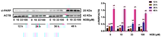 The effect of NOB on cleaved PARP (cl-PARP) of BeWo cells. The expression of cl-PARP was measured by Western blot. Data were summarized as mean ± SD, n = three independent experiments. At the same NOB treatment dose, different lowercase letters represent significant differences at different treatment times, p < 0.05. At the same treatment time, different capital letters represent significant differences at different NOB doses, p < 0.05, one-way ANOVA, with Duncan’s multiple range test.