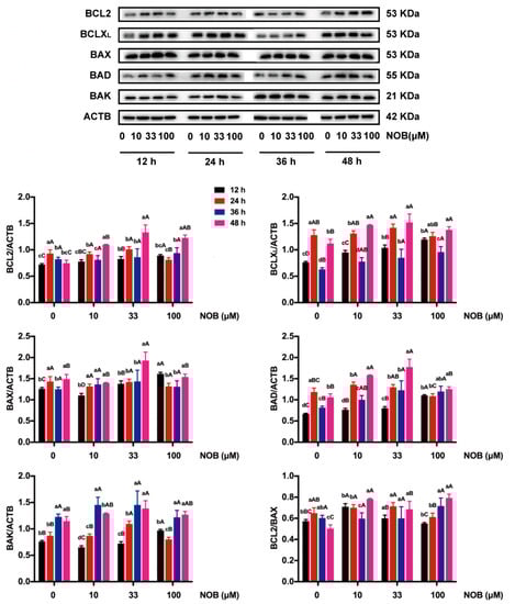 The effect of NOB on expressions of selected members of the B cell lymphoma 2 (BCL2) family genes of BeWo cells. B cell lymphoma 2 (BCL2) family genes in this study included BCL2, BCLXL, BAX, BAD, and BAK. The ratio of BCL2/BAX was calculated. The protein expressions of selected members of the BCL2 family genes were estimated by Western blot. ACTB was used as an internal control, and the relative protein expression was the ratio of target protein to ACTB. Data were summarized as mean ± SD, n = three independent experiments. At the same NOB treatment dose, different lowercase letters represent significant differences at different treatment times, p < 0.05. At the same treatment time, different capital letters represent significant differences at different NOB doses, p < 0.05, one-way ANOVA, using Duncan’s multiple range test.