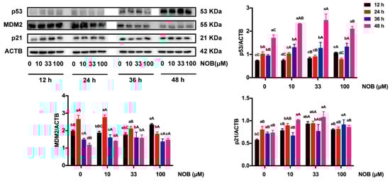 The effect of NOB on expressions of p53 pathway genes of BeWo cells. The protein expressions of p53, MDM2, and p21 were estimated by Western blot. ACTB was used as an internal control, and the relative protein expression was the ratio of target protein to ACTB. Data were summarized as mean ± SD, n = three independent experiments. At the same NOB treatment dose, different lowercase letters represent significant differences at different treatment times, p < 0.05. At the same treatment time, different capital letters represent significant differences at different NOB doses, p < 0.05, one-way ANOVA, using Duncan’s multiple range test.