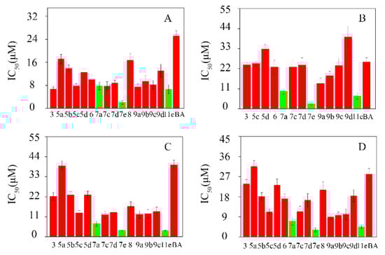 The cytotoxicities of the BA-nitrogen heterocyclic derivatives to different tumor cells. (A): Hela; (B): HepG-2; (C): BGC-823; (D): SK-SY5Y.