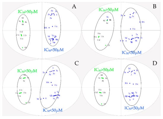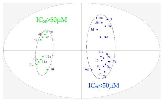 To further explore the structure–activity relationship, OPLS-DA was performed for all designed BA derivatives. Analyses revealed an antitumor activity discrimination between the different BA derivatives. As for the effect of the structure modification site and different nitrogen heterocyclic rings of BA, they were divided into two groups according to the difference in the in-vitro antitumor activity (Figure 3 and Figure 4). Through data analysis, we found that the structure modification site on BA showed a certain degree of regularity in their effect upon activity, the structural modification at positions C-3 and C-28 could improve antitumor biological activity in vitro, while the structural transformation of C-28 might have more potential to enhance cytotoxicity on the same series of tumor cells; for example, the antitumor activities of compounds 7a, 7c, 7d and 7e were stronger than compounds 5a, 5b, 5c and 5d. In addition, different nitrogen heterocyclic rings on BA also affected their activity (compound 11e > compound 11a, 11b, 11c and 11d). The cluster analysis of OPLS-DA might provide us with further directions for the further analysis of BA derivatives. All data were analyzed using SIMACA 13.0. Analysis showed no samples being outside the Hotelling T2 95% confidence ellipse that could influence the analyses, and high values of explained variation and predictive ability were obtained (Table 3). Besides, the values of explained variation and predictive ability were 0.883 and 0.978, respectively, according to OPLS-DA for the IC50 of four tumor cells shown in Figure 4.