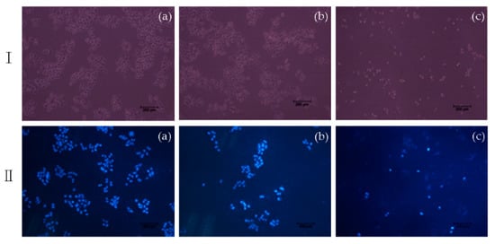 Cell morphology under fluorescence microscope (I) and DAPI (II) staining on Hela cells induced by compound 7e with 5 μM: (100 ×) (a) Control; (b) BA; (c) 7e.