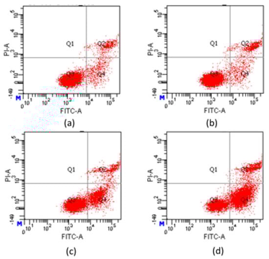 Hela cells in the logarithmic growth phase were plated onto 6-well plates at a density of 4 × 104 cells/mL at 37 °C in a humidified atmosphere with 5% CO2. After incubation for 24 h, Cell culture medium was discarded, and cells were treated with various concentrations (0, 1, 2, or 4 μM) of compound 7e for a further 48 h. Then, cells were collected, washed twice with cold PBS, and centrifuged at 2400 rpm for 10 min. The resulting pellet was mixed with 200 μL of binding buffer of the Annexin V-FITC kit; then, 5 μL of FITC-labeled annexin V was added and mixed gently. After incubation at 4 °C for 10 min in the dark, 5 μL of PI was added and mixed gently. Then, the cells were immediately analyzed with a flow cytometer at 488 nm [26,27].