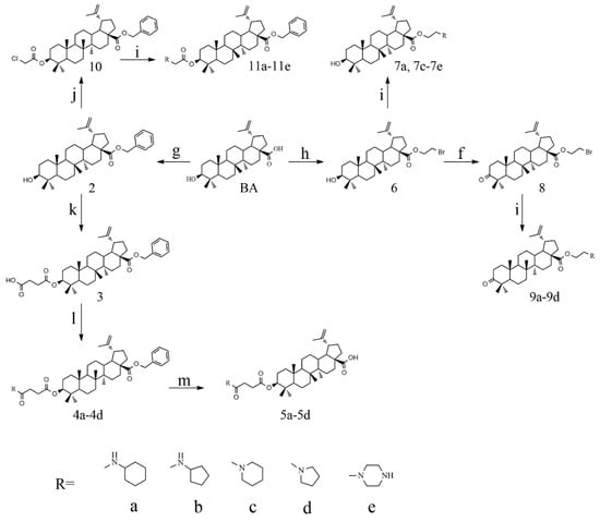 Synthesis routes of betulinic acid (BA)-nitrogen heterocyclic derivatives. Reagent: (f) chromic acid, acetone; (g) benzyl bromide, K2CO3, dimethylformamide (DMF); (h) 1, 2-dibromoethane, K2CO3, DMF; (i) nitrogen heterocyclic ring, K2CO3, DMF; (j) chloroacetic acid, 4-dimethylaminopyridine (DMAP, (CH3)2NC5H4N), 1-Ethyl-3-(3-dimethylaminopropyl)carbodiimide (EDCI) and DCM; (k) succinic anhydride, DMAP, as well as dichloro-methane (DCM). (l) nitrogen heterocyclic ring, HoBt, where was thus used some EDCI, N,N-Diisopropylethylamine (DIPEA), DCM; (m) Pt/C, MeOH, H2.