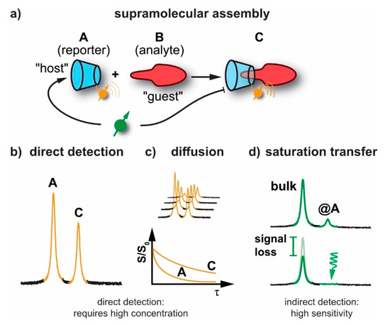 Diffusion NMR might be considered for characterizing solution-based intermolecular interactions and for studying the dynamics between the molecules of interest and the surrounding media. It is well suited for revealing changes in molecular mass upon supramolecular assembly through reduced, translational diffusion through a magnetic field gradient that induces a signal loss (So→S, see Figure 2c). It has been applied to polymers [41], zeolites and porous materials [42,43,44], as well as to surfactants [45], liquid crystals, membranes [46] and proteins [47,48,49]. So-called q-space diffusion NMR [50,51] was helpful in obtaining structural information and compartment size of assemblies like biomembranes by sensing diffusion in restricted geometries [52,53]. However, diffusion NMR requires a certain lifetime of the assembly and systems with fast dissociation are not really captured by this method. Similar to above NMR techniques, diffusion NMR also requires usage of high concentration of samples and suffers from relatively low sensitivity and long acquisition times, respectively.