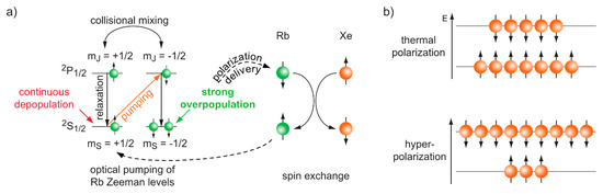 Hyperpolarization of 129Xe through SEOP. (a) Optical pumping of the Rb electron system and subsequent spin transfer onto Xe in a binary collision. (b) Enhanced population difference in the hp spin system compared to the condition with thermal polarization. In this case, the pumped Rb system causes an overpopulation of the upper Xe spin energy level. The eventually detected signal is proportional to the polarization P and the spin density.