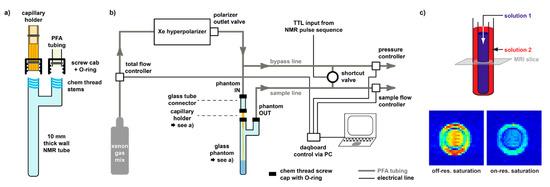 Setup for Xe-NMR of supramolecular systems in solution. (a) Sample holder for dispersion of hp 129Xe into solution. (b) Setup illustrating the interplay between the hyperpolarizer, the connected sample holder, and the valve and pressure control via a PC and the NMR pulse sequence. For more details, see [124]. (c) Double phantom setup with exemplary MRI data showing a stronger saturation response for the inner compartment with a Xe host.