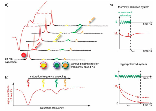Xe is an ideal and versatile nucleus for this technique since it undergoes many transient interactions with molecular partners. Its large chemical shift range enables excellent selectivity when applying the saturation pulse and allows “multiplexing” for working with multiple guests [141]. It is thus much more efficient in detecting relative fast exchanging spin systems because the larger frequency separation between the connected pools represents two important advantages: a) the fast exchange regime in which the pools cannot be resolved any more occurs only for relatively high frequencies (> 105 Hz) and b) it is possible to apply relative strong saturation pulses without causing a “spillover” effect (i.e., the off-resonant RF pulse already directly affects the detected bulk pool).