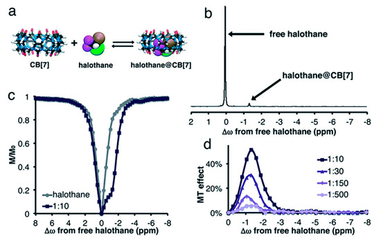 Example of 19F-GEST spectroscopy with CB[7]. (a) Water-soluble halothane forms an inclusion complex with CB[7]. (b) The exchange of halothane is much slower compared to Xe•CB[7], as seen by the appearance of a second peak in the direct spectrum. (c) Addition of CB[7] to dissolved halothane causes a pronounced saturation transfer response that overlaps with direct saturation of free halothane. (d) Even a 50-fold dilution of the CB[7] fraction keeps the supramolecular complex detectable. Reproduced from [58], published by The Royal Society of Chemistry, licensed under a Creative Commons Attribution 3.0 Unported Licence 20 December 2019).