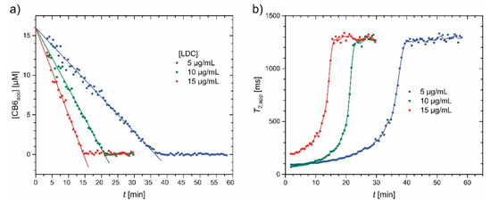 To overcome this issue, a new method developed by Nau and co-workers, coined supramolecular tandem assays (STAs) [27,28,29,30], was utilized as a time-resolved version of indicator displacement assays involving no immediate competitor. The molecular unit displacing the reporter is generated during the course of an enzymatic reaction. Such STAs are beneficial for real-time continuous monitoring of enzymatic activity via changes in concentration of either the substrate or the product where one of them leads to competitive displacement of the dye from a macrocyclic host, e.g., cucurbit[n]urils (CB[n]s) [31]. STAs are successfully used for monitoring different enzymatic transformations linked to amino acids, biogenic amines, amino aldehydes and nucleotide phosphates, respectively [28,29,30,32]. Introduction of an enzyme in the assay leads either to an increase in fluorescence intensity with time (switch-ON assay) or a decrease (switch-OFF assay), depending upon the photophysical signature of the dye. Strong binding of either the product or the substrate to the macrocyclic host enables two different supramolecular assays, namely product- [28,31] or substrate-selective assays [30,32,33].