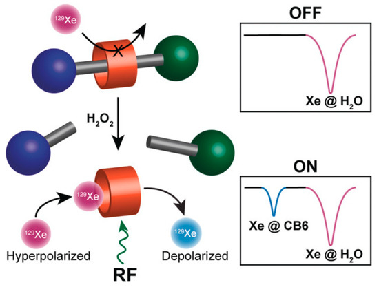 - Klass, S.H.; Truxal, A.E.; Fiala, T.A.; Kelly, J.; Nguyen, D.; Finbloom, J.A.; Wemmer, D.E.; Pines, A.; Francis, M.B. Rotaxane Probes for the Detection of Hydrogen Peroxide by 129 Xe HyperCEST NMR Spectroscopy. Angew. Chem. Int. Ed. Engl. 2019, 58, 9948–9953. [Google Scholar] [CrossRef] [PubMed]