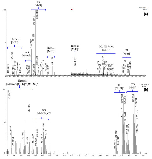 (a) REIMS (-) spectrum over the mass range 100–950 m/z—the 500–950 m/z region was magnified of a 16 factor; (b) REIMS (+) spectrum over the mass range 470–950 m/z. A class identification is also reported, along with the ion type detected. DG = diglyceride; FA = fatty acid; MG = monoglyceride; PA = phospatidic acid; PE = phosphatidylethanolamine; PG = phosphatidylglycerol, PI = phosphatidylinositol; TG = triglyceride.