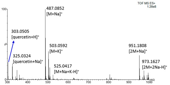 Taking into account the novelty of the REIMS ionization source, which most commonly focused on lipid compounds [13,14,15,16,17,18,20,21,22,23,24,25,26,31,32], some additional experiments were necessary to confirm the identification of these phenols. In particular, the polyphenol isoquercetrin, available as pure standard, was infused by the syringe pump into the REIMS source to elucidate the ionization mechanism in positive polarity. The spectrum, reported in Figure 3, highlights a very intense signal for the sodium adduct, confirming previous hypothesis. Also, the potassium adduct and the sodiate dimer were observed, thus increasing the reliability of the tentative identification of daidzein, epigallocatechin-p-coumaroate and verminoside, identified as sodiate dimer, sodium and potassium adduct with a mass error minor than 10 ppm. Within this context, the detection of more adduct ions represented a further confirmation of the proposed identity for each signal. Furthermore, the ion corresponding to the aglycon portion, in this case quercetin, was detected along with its sodiate adduct, thus pinpointing a certain degree of in-source fragmentation. This could be the reason for which the further fragmentation of the parent ions at different collision energy did not produce any intense MS/MS spectrum, especially if acquired by cutting the sample with the electroknife rather than in direct infusion mode. However, some diagnostic fragments were observed such as the ion at m/z 324.02 which corresponds to the loss of the glucoside portion from the sodiate adduct (Figure S8).