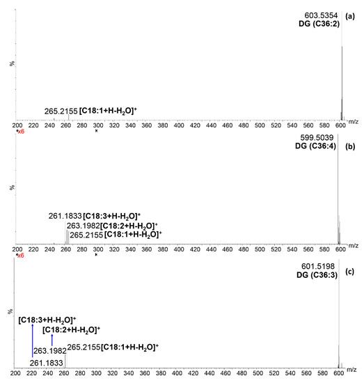 Conversely, from phenolic compounds, which were partially reported in the literature about this fruit, the characterization of the native lipid composition is here reported for the first time. Very recently, Gomes and co-workers [44] reported the FA profile of the K. africana seed oil, after the conversion of intact lipids into FA methyl esters, namely after the breaking of the ester bond of the original lipid. The qualitative profile obtained in that study is in agreement with FAs identified in the present work. In particular, as from Figure 2a and Table 3, palmitic acid (C16:0) was the most abundant saturated FA, followed by stearic acid (C18:0), heneicosanoic acid (C21:0), arachidic and docosanoic acids (C20:0 and C22:0, respectively), heptadecanoic acid (C17:0) and myristic acid (C14:0), listed according to decreasing signal intensity. Among monounsaturated FA, octadecenoic acid (C18:1) was the most abundant, followed by small amounts of hydroxy-octadecenoic acid and heptadecenoic acids (C18:1OH and C17:1, respectively), and very small levels of hexadecenoic acid and eicosenoic acids (C16:1 and C20:1, respectively). Finally, very intense signals were generated from octadecadienoic acid and octadecatrienoic acid (C18:2 and C18:3), which were the only polyunsaturated FAs detected. On the basis of these semi-quantitative considerations, it should be possible to select the most probable combination of FAs in PLs, di- and tri-glycerides (DG and TG, respectively) from the list of candidates coming from Progenesis QI. For instance, DG and PLs containing 5 and 6 double bonds most likely derive from the combination of C18:2 and C18:3 or two C18:3. Similarly, when only 1, 2 or 3 unsaturations were present in DG and PL characterized by a carbon number of 34 and 38, the combinations of C18:1, C18:2 and C18:3 with C16:0 and C20:0 could be selected as the most probable. As a consequence, only the DG and PL species in which carbon number is equal to 36 and the unsaturations range from 0 to 4 needed for MS/MS confirmatory analysis. Figure 4 shows the MS/MS spectra for DG (C36:2), DG (C36:3) and DG (C36:4) in the region m/z 200–300 in which it was possible to detect under the specific collision energy employed (30 eV) the fragments corresponding to the protonated dehydrated FA. In the first case (Figure 4a), the isomer DG (C18:2/C18:0) was completely excluded because of the absence of both fatty acid fragments, then the m/z 603.53 corresponds only to the species (C18:1/C18:1); in the second case (Figure 4b), the presence of three different fragments of similar intensity in the MS/MS spectrum of the ion 599.50 m/z led to the identification of two DG species (C18:3/C18:1 and C18:2/C18:2), probably at similar concentrations; finally, in the third case the MS/MS spectrum of the ion 601.52 m/z (Figure 4c) shows three fragments of different intensity, then it corresponds to the mixture of two DGs (C18:2/C18:1 and C18:3/C18:0), but one of them (C18:2/C18:1) is significantly more abundant, while the other one (C18:3/C18:0) is present at very low level, even considering the absence of the C18:0 fragment.