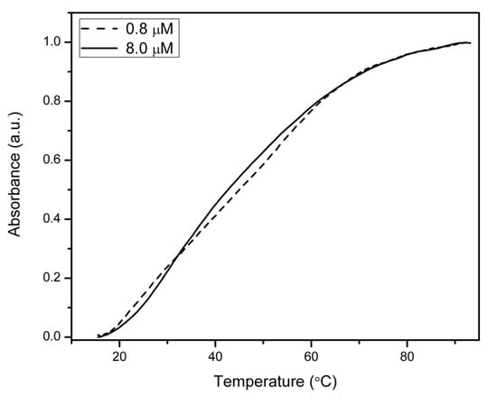 UV melting transition observed at 275 nm for struc_γPNA is independent of strand concentration over a 10-fold range. Buffer contained 10 mM Tris-HCl (pH = 7.4), 100 mM NaCl, 0.1 mM Na2EDTA.